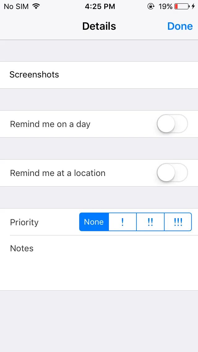 The Reminders app still feels somewhat skeuomorphic because of the background texture. Pay attention to Priority, it gives the impression of having been done in a rush. In the latest operating systems this is just a standard text selector (high, medium, low).